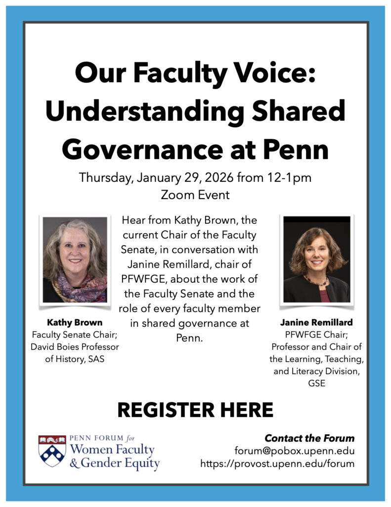 Hear from Kathy Brown, the current Chair of the Faculty Senate, in conversation with Janine Remillard, chair of PFWFGE, about the work of the Faculty Senate and the role of every faculty member in shared governance at Penn.