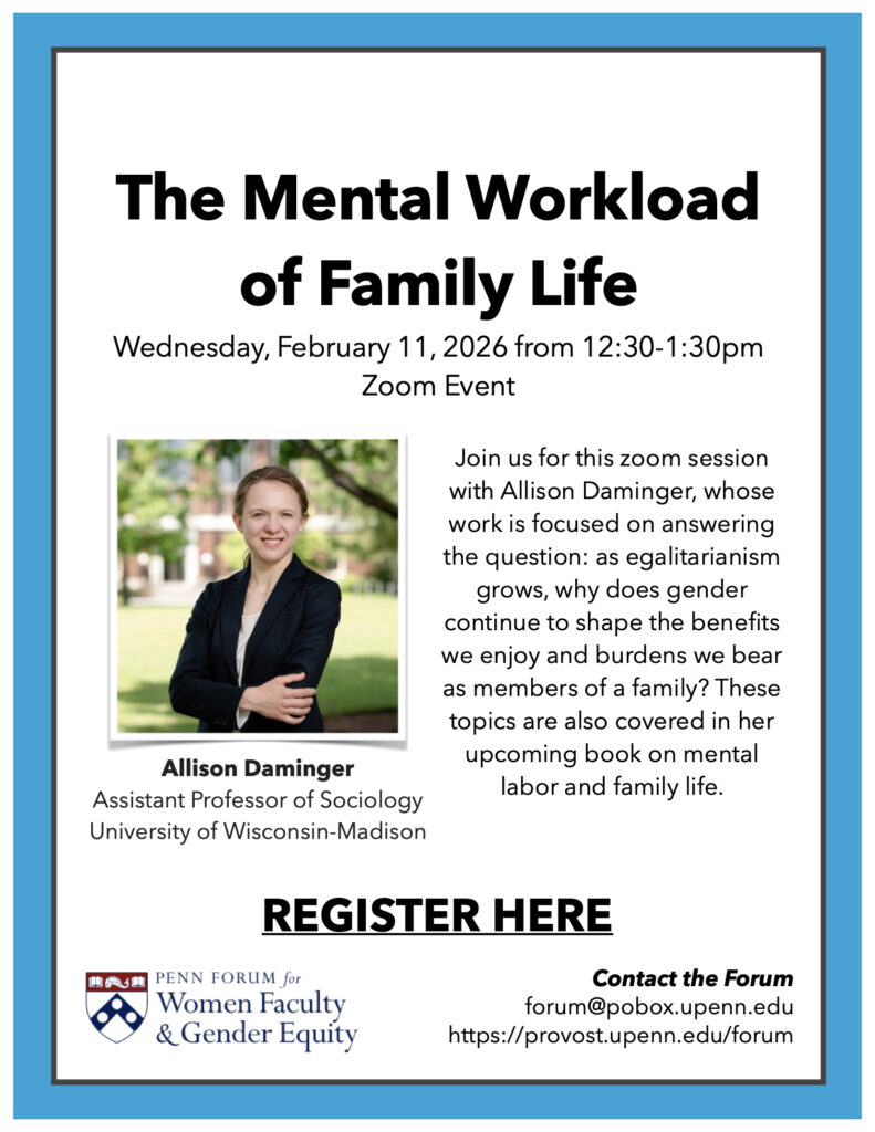 Join us for this zoom session with Allison Daminger, whose work is focused on answering the question: as egalitarianism grows, why does gender continue to shape the benefits we enjoy and burdens we bear as members of a family? These topics are also covered in her upcoming book on mental labor and family life.