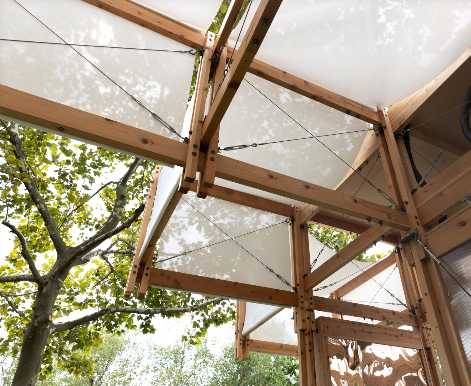 “This pavilion demonstrates a scalable cooling shelter,” Aviv says, “which can educate people—especially policymakers—about the future of urban cooling.” The pavilion’s open-air design allows for natural ventilation, minimizing outdoor heat stress when combined with shade and ensuring construction costs remain low. (Photo of KlimaKover panels by Chris Perez).
