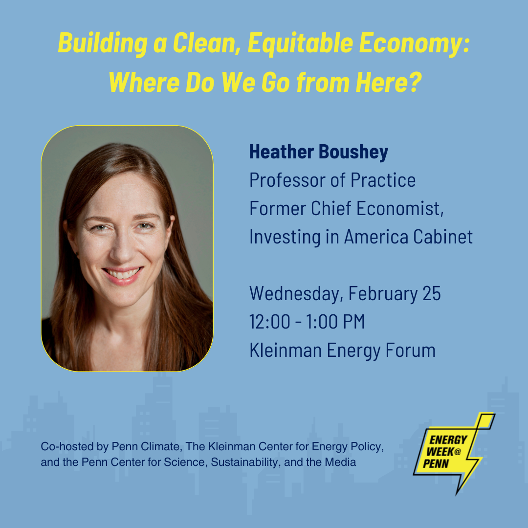 Penn Climate, the Kleinman Center for Energy Policy, and the Penn Center for Science, Sustainability, and the Media, welcome Heather Boushey, Professor of Practice at the Kleinman Center and former Chief Economist to President Biden’s Investing in America Cabinet, for a conversation during Energy Week.
