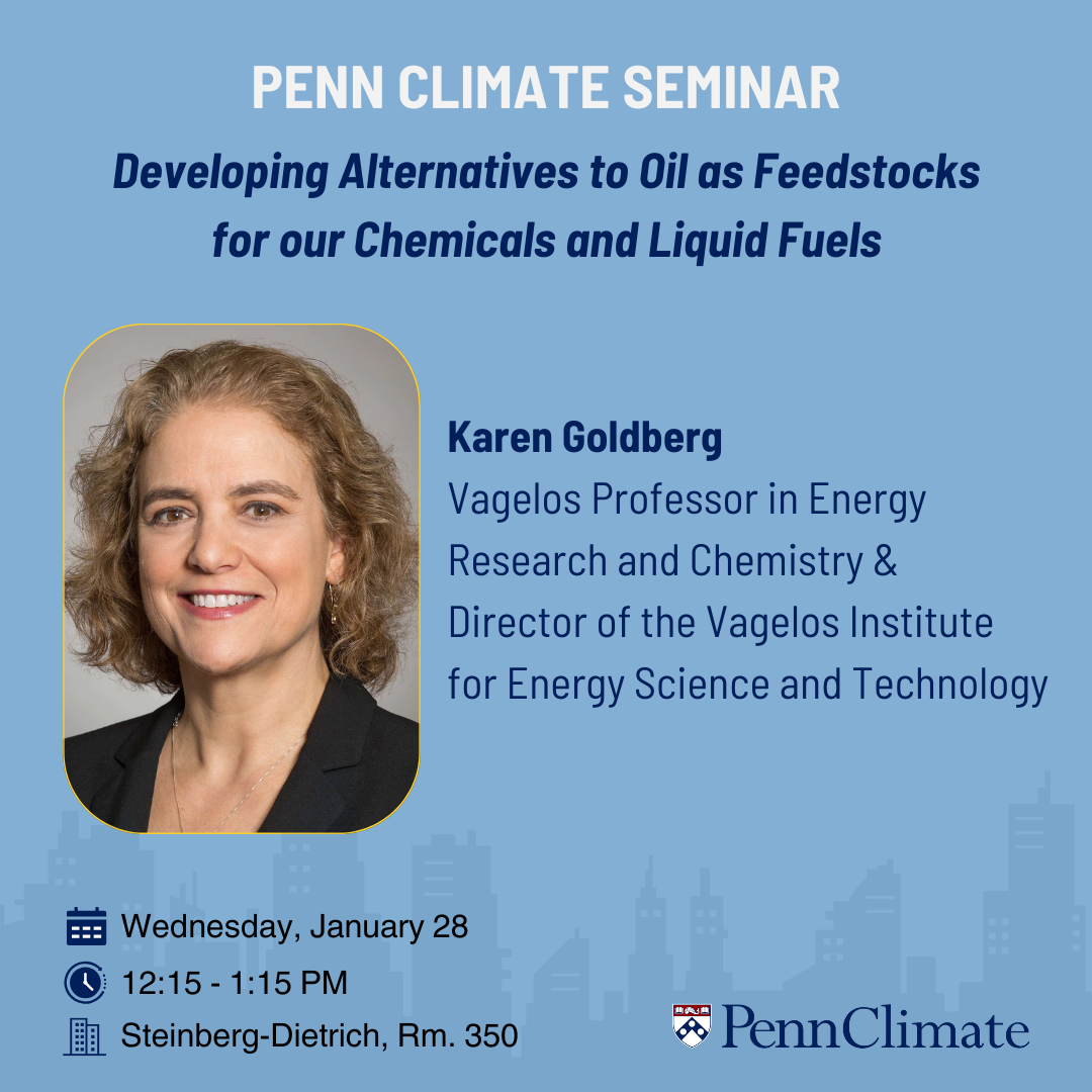 Penn Climate is excited to welcome Karen Goldberg, Vagelos Professor in Energy Research and Chemistry, and the inaugural Director of the Vagelos Institute for Energy Science and Technology, to kick off our spring seminar series. She will discuss “Developing Alternatives to Oil as Feedstocks for our Chemicals and Liquid Fuels,” exploring why the challenge of decarbonization extends far beyond energy production itself.